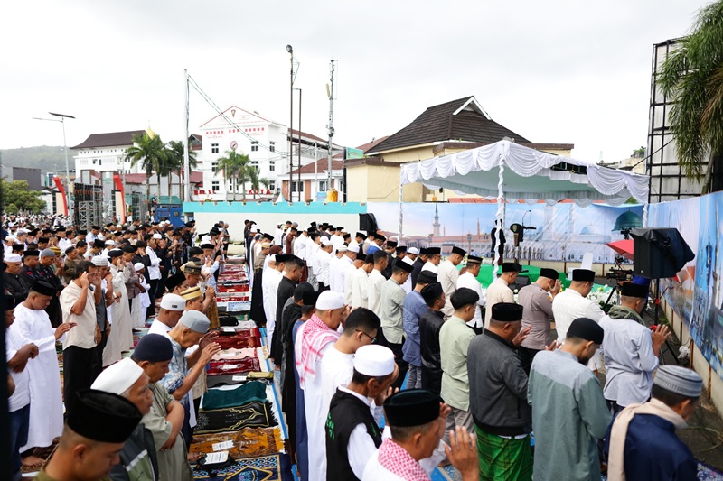 Pelaksanaan Sholat Idul Fitri tersebut dipimpin oleh Imam Drs. H. Hadi Basalamah, M.Fil.I., dan diikuti oleh ribuan jamaah yang memadati Lapangan Merdeka dalam suasana penuh kekhusyukan dan kebersamaan.