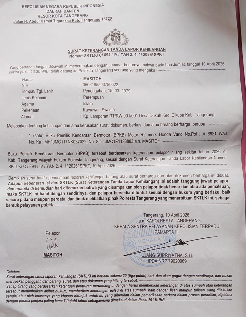 KABUPATEN TANGERANG, Suararepubliknews.com- Seorang warga Kecamatan Cikupa, Kabupaten Tangerang, melaporkan kehilangan dokumen penting berupa Buku Pemilik Kendaraan Bermotor (BPKB) ke Polresta Tangerang. Laporan tersebut tertuang dalam Surat Keterangan Tanda Lapor Kehilangan (SKTLK) yang diterbitkan pada Jumat, 10 April 2026.