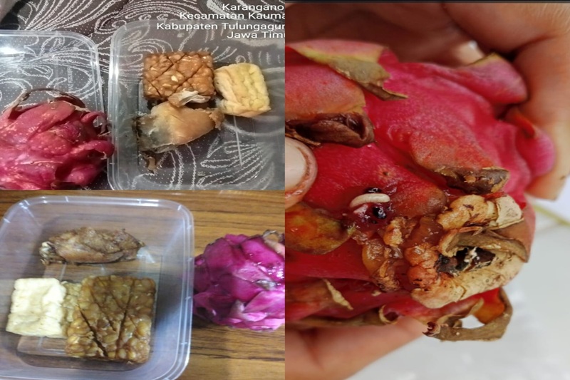 Suwandi, orang tua murid PAUD Karanganom, Kecamatan Kauman, Kabupaten Tulungagung, mengaku kaget ketika mendapati buah naga yang dibagikan bersama tempe, tahu, dan ayam goreng itu sudah rusak dan berbelatung. “Baru perdana dibagikan, ternyata banyak buah naganya busuk,” ungkapnya dengan getir.