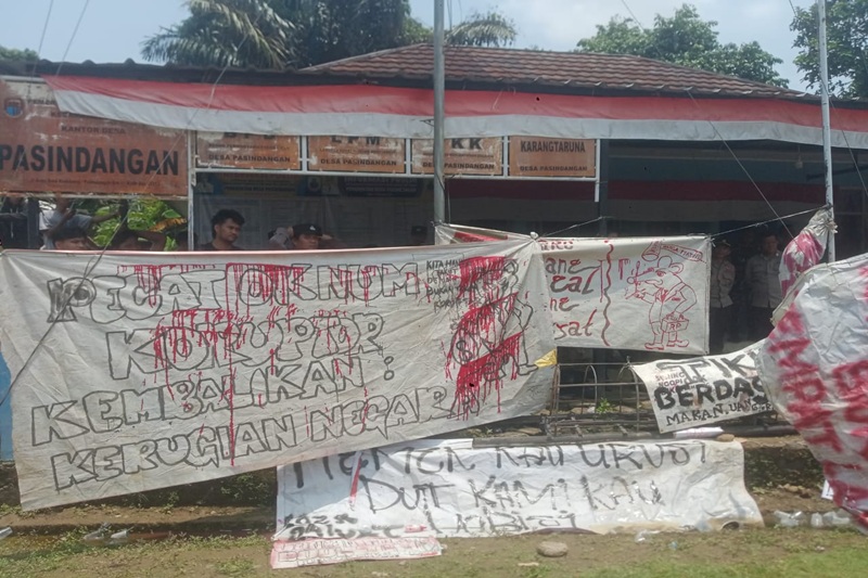 Warga membawa spanduk, poster, dan melakukan orasi keras yang berisi desakan agar Kepala Desa Pasindangan segera mengundurkan diri.