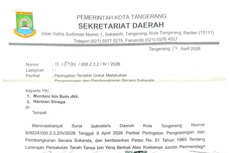 TANGERANG, SRN – Nafas lega warga di sekitar Jalan Husen Sastranegara, Benda, seketika sesak. Sebuah surat peringatan berkode *318790/000.2.3.2 / IV/2026* mendarat di tangan H. Murdani bin Boin pada Jumat (17/4/26), memerintahkannya angkat kaki dalam waktu singkat dari lahan yang telah ia tempati selama hampir seperempat abad. Kasus ini menjadi potret terbaru benturan antara klaim aset negara dan hak penguasaan fisik tanah oleh warga sipil.