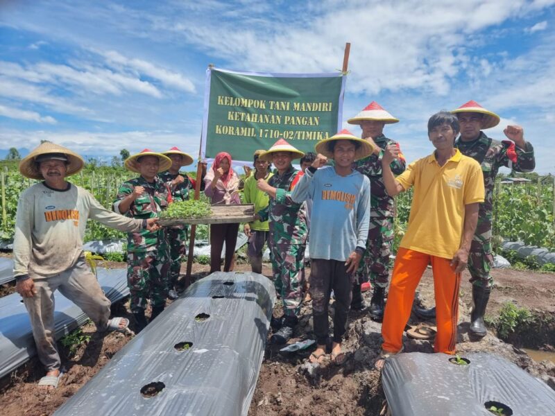 Dalam rangka membantu pemerintah mewujudkan ketahanan pangan, Babinsa Koramil 1710-02/Timika dipimpin Serma Butarbutar ajak kelompok tani binaan tanam 7000 bibit Melon di kebun percontohan milik Koramil 1710-02/Timika
