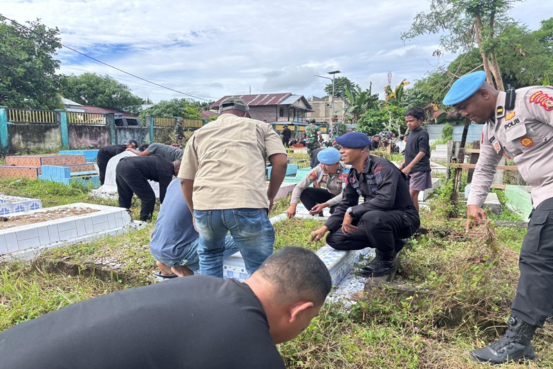 MALUKU- Satuan Brimob Polda Maluku bersama Forum Solidaritas Pemuda (Fospem) Bula Raya melaksanakan kegiatan pembersihan lingkungan di Tempat Pemakaman Umum (TPU) Islam yang berada di Pantai Pos Desa Bula, Kabupaten Seram Bagian Timur (SBT).