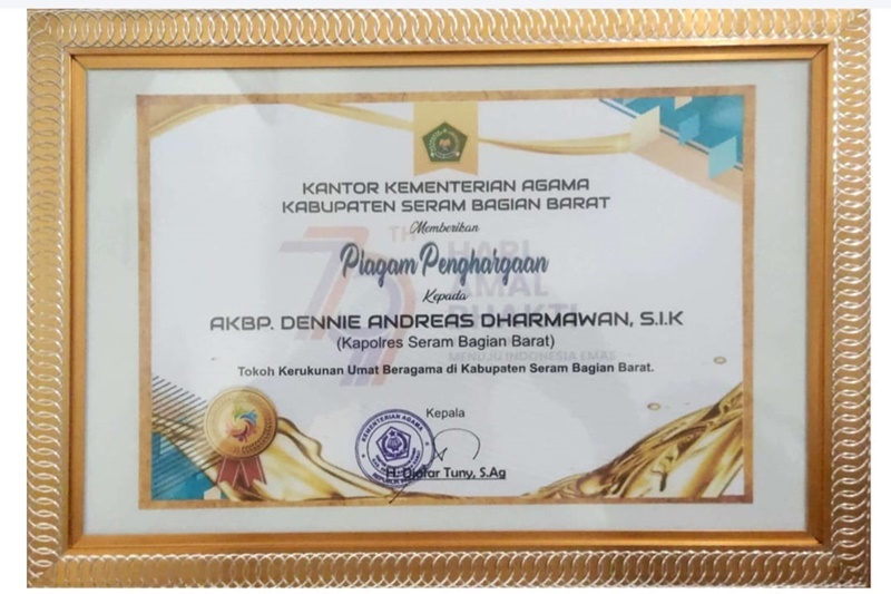 Kapolres Seram Bagian Barat (SBB), AKBP Dennie Andreas Dharmawan, Dapat Penghargaan Dari Kemenag, Sabtu (4/1/2025).