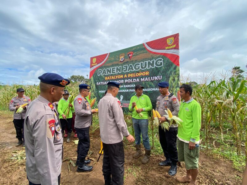 MALUKU- Dukung ketahanan pangan nasional, Satuan Brimob Polda Maluku melakukan panen jagung di lahan seluas 1,5 hektar yang berada di Dusun Telaga Kodok, Kecamatan Leihitu, Kabupaten Maluku Tengah.