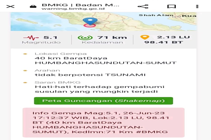 Gempa bumi berkekuatan 5.1 Magnitudo dan kedalaman 71 Km yang mengguncang Kabupaten Humbang Hasundutan, (26/6).