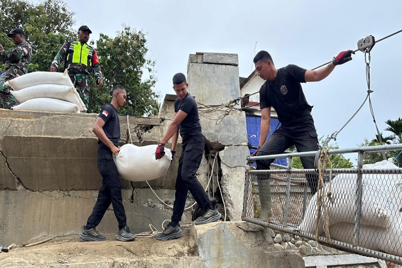 Bireun, SRN – Personel SAR Satuan Brimob Polda Aceh membantu menyalurkan bantuan logistik untuk masyarakat terdampak bencana di Desa Kubu, Bireuen, dengan menggunakan jembatan Sling Baja.