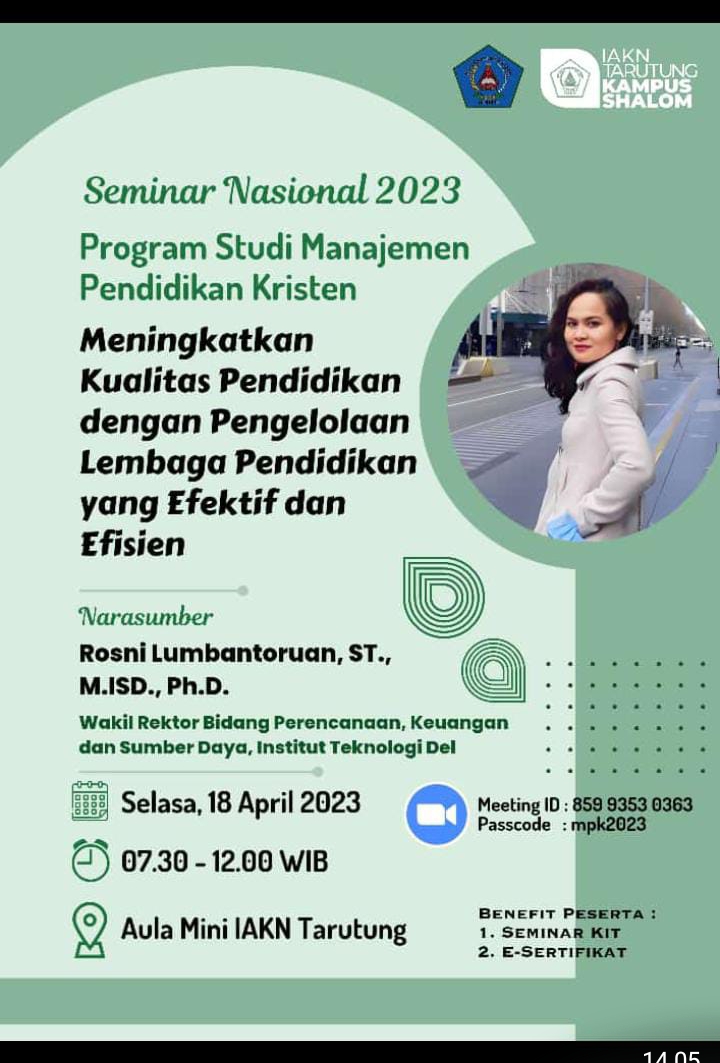 Kegiatan seminar ini dihadiri oleh Bapak Rektor IAKN Tarutung, Dekan FIPK, Wakil Dekan, Kaprodi, Dosen Manajemen Pendidikan Kristen terutama mahasiswa MPK IAKN Tarutung. Pendidikan yang efektif dan efisien akan dapat terjadi jika pendidikan berhasil mencapai tujuan pendidikan secara maksimal dengan menggunakan sumber daya yang tersedia.