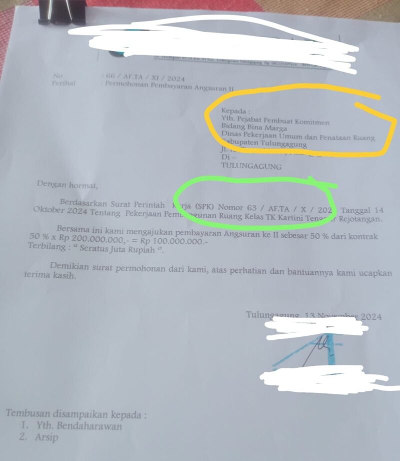 Dalam surat yang dikeluarkan oleh Cv al fatah menyebutkan ada keterlibatan petugas pembuat kebijakan (ppk) didinas PU BINA MARGA,ketika hal tersebut dikonfirmasikan ke sekretaria dinas  PU kabupaten tulungagung melalui pesan singkat,beliau dengan tegas menyangkalnya.