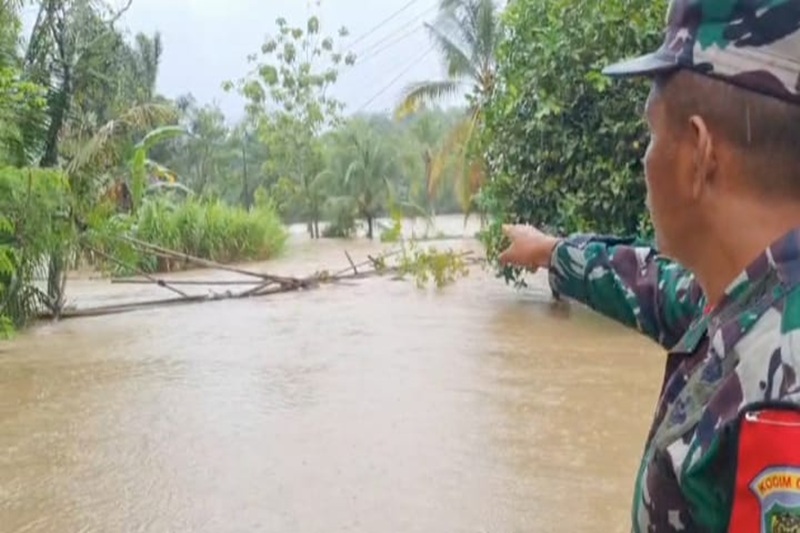 Kapten Inf Purgiarto, Danramil 0116/Cikeusik Kodim/0601 Pandeglang, langsung meninjau lokasi jembatan yang hanyut tersebut.