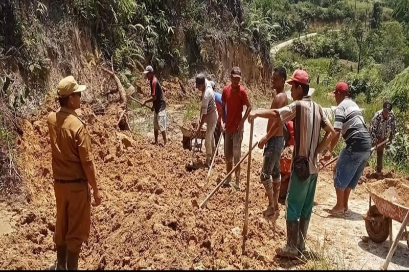 Dan kejadian itu pun, langsung cepat direspon kepala Desa dan beserta perangkat desa dibantu beberapa warga melaksanakan gotong royong guna membersihkan reruntuhan tanah longsor yang menghambat akses jalan dimaksud.
