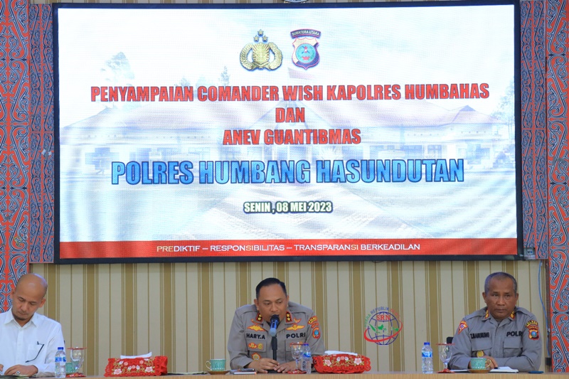 Doloksanggul (Humbahas), Suararepubliknews.com – Kapolres Humbang Hasundutan menyampaikan commander wish dan program kerjanya selama memimpin Polres Humbang Hasundutan kedepannya dengan dihadiri oleh seluruh PJU dan Kapolsek jajaran yang dilaksanakan di Aula DP. Silitonga Polres Humbang Hasundutan. Senin (08/05/2023).