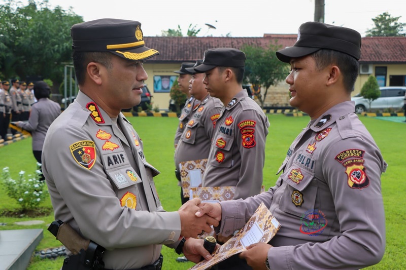 Kombes Pol Arif Budiman, S.I.K, M.H, berikan penghargaan kepada empat personel Polsek Pabuaran di Lapangan Apel Mapolresta Cirebon, Senin (30/1/2023).