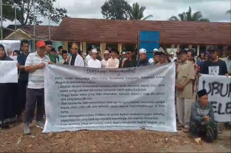 “Kami warga masyarakat Desa Kerta, Kecamatan Banjarsari, Kabupaten Lebak, dengan ini menyatakan bahwa setelah melalui musyawarah bersama, kami telah menuntut Kepala Desa Kerta untuk mengundurkan diri secara terhormat dalam waktu 5×24 jam. Hingga batas waktu yang telah ditentukan, tuntutan tersebut tidak diindahkan oleh yang bersangkutan. Oleh karena itu, kami menyatakan tidak lagi mengakui Kepala Desa Kerta sebagai kepala desa yang sah, dan menolak segala bentuk kepemimpinannya di Desa Kerta.