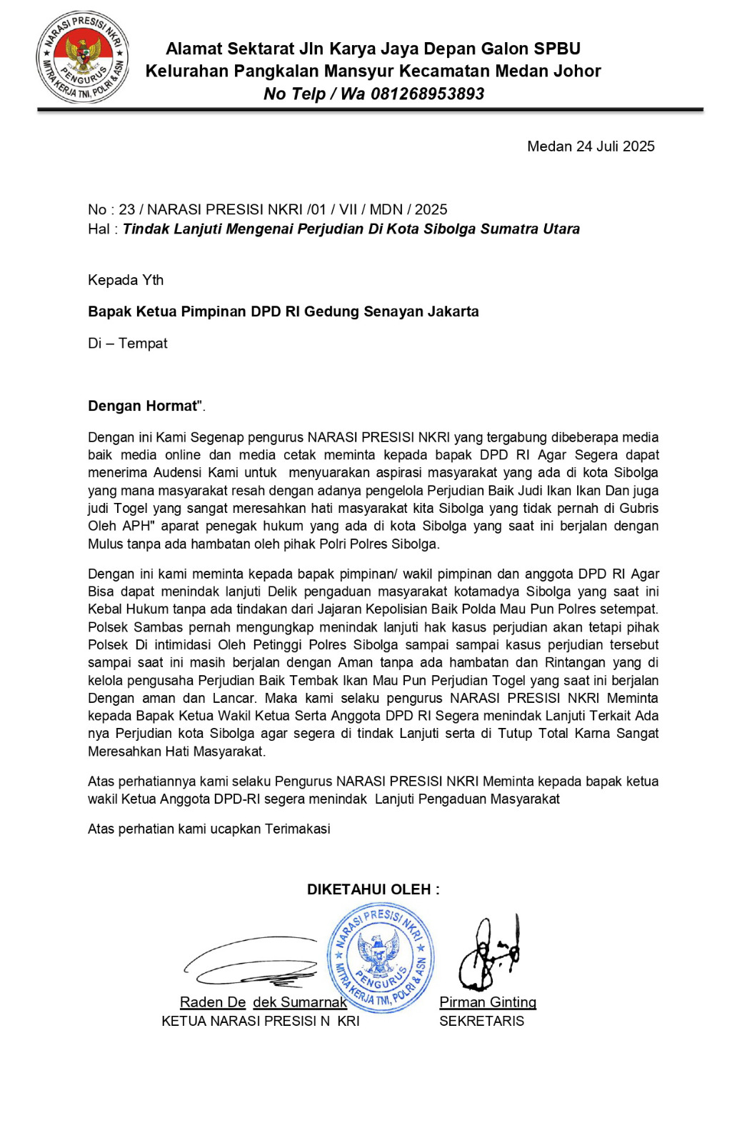 SI PRESISI NKRISibolga,Suararepubliknews.com – Ketua NARASI PRESISI NKRI yang diketuai oleh Raden Dedek Sumarnak Berama Sekjen Pirman Ginting telah mengirim Surat Ke Pimpinan Ketua DPD RI Dan Anggota DPD RI Terkait bebas nya oprasi perjudian yang berada di Sibolga tepatnya jalan Ahmad Yani Scuer Kota Sibolga yang kini hangat hangatnya praktek mapia perjudian yang di awasi seorang pemuda yang diduga bernama Ucok Kelewang CS diduga bersama para petinggi polres sibolga yang saat ini masih berjalan aman dan Langgeng seolah oleh tutup mata.,Jumat (25 /07/2025).