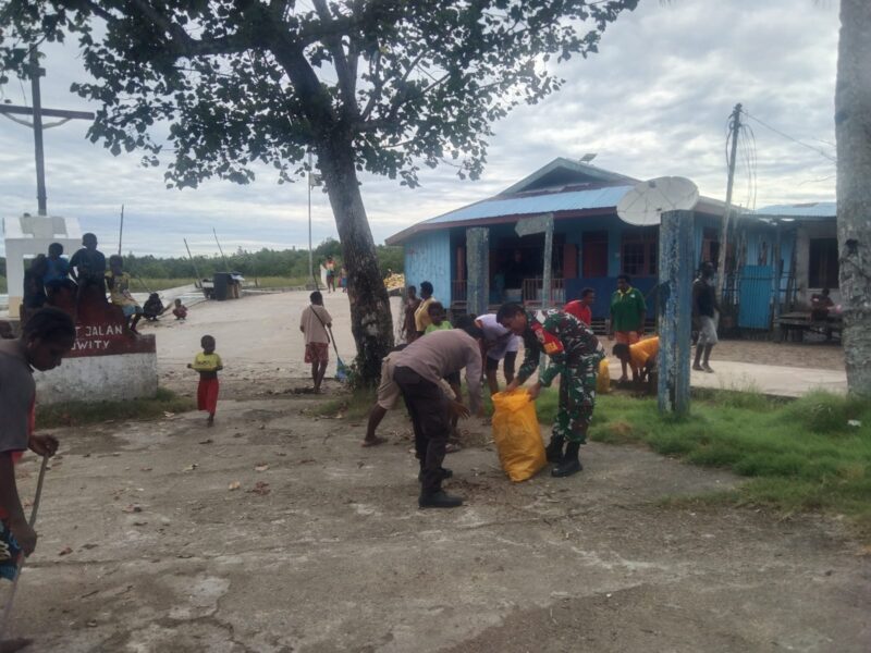 Babinsa Koramil 1710-01/Kokonao mengajak warga bergotong royong membersihkan pelabuhan di Kampung Kokonao, Distrik Mimika Barat, Kab. Mimika, Rabu (17/01/2024).
