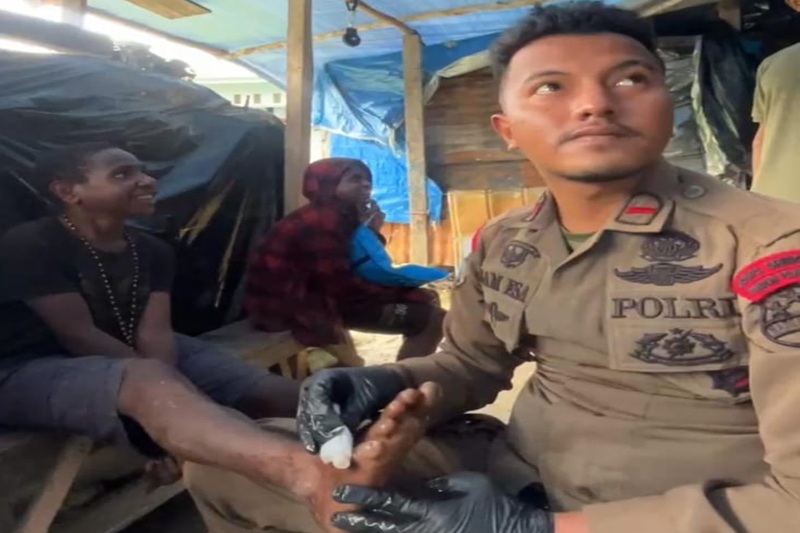 Dalam kegiatan kemanusiaan tersebut, personel Ops Damai Cartenz 2025 dengan sigap dan penuh kepedulian merawat luka anak yang tampak cukup serius.