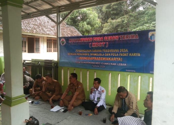 Lebak, suararepubliknews.com – Selasa, 2 Juli 2024, Pemerintah desa Sukasenang melakukan Musyawarah Desa Serah Terima (MDST) untuk menyampaikan hasil pembangunan sarana prasarana desa. Pembangunan dilakukan dengan mekanisme swakelola dan pola padat karya (Bangsapras swakarya).