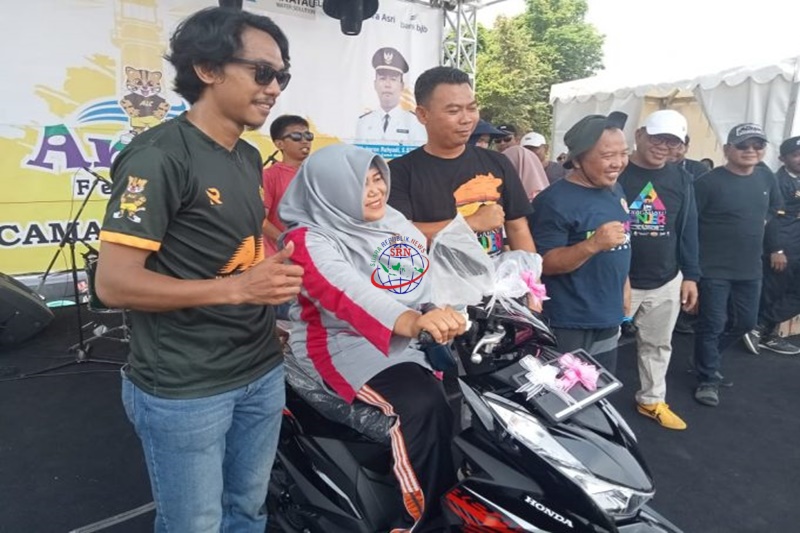 Pemenang Doorprize Utama motor Honda Beat dengan pemegang no undian 0990 Bu Halimah warga Desa Mekarsari Kecamatan Anyer di serahkan langsung kuncinya oleh Camat Anyer, H. Imron Ruhyadi, S.STP., M.Si.