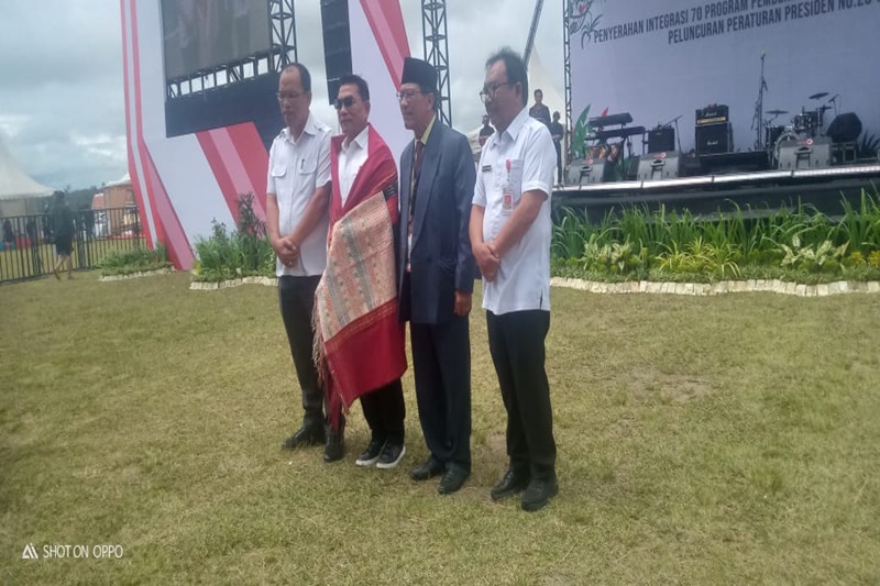Bupati Humbahas Dosmar banjarnahor Bersama Kepala KSP Moeldoko saat Penyerahan Integrasi 82 Program Pemberdayaan Masyarakat Perhutanan Sosial Lintas Kementerian Dan BUMN.