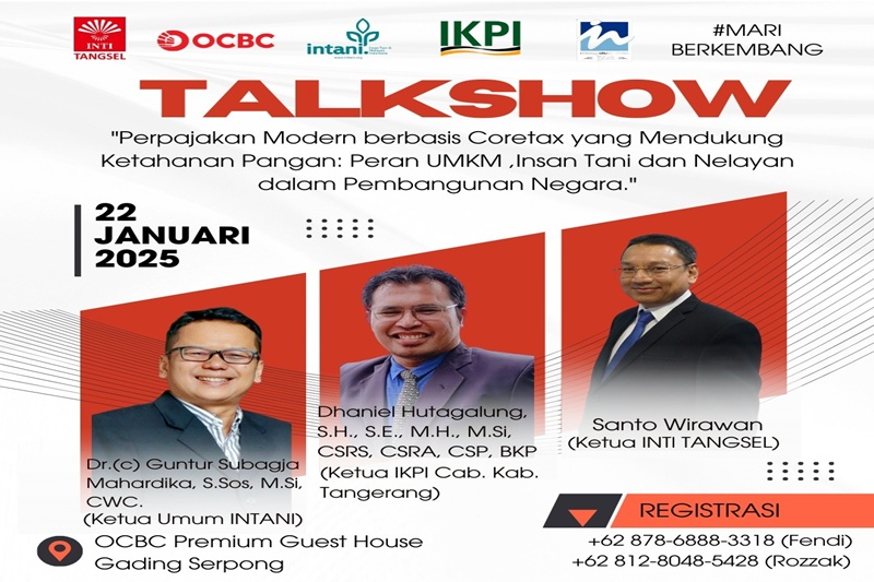 Tangerang Selatan, Suararepubliknews – Perhimpunan INTI Tangerang Selatan, bekerjasama dengan mitra strategisnya yaitu Bank OCBC, INTANI, dan IKPI, dengan bangga mengumumkan penyelenggaraan acara talkshow bertema “Perpajakan Modern Berbasis Coretax yang Mendukung Ketahanan Pangan: Peran UMKM, Insan Tani, dan Nelayan dalam Pembangunan Negara, 22 Januari 2025 .