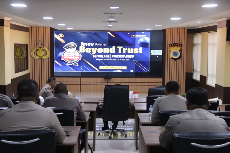 MALUKU- Kepolisian Daerah Maluku mengikuti rapat Analisa dan Evaluasi (Anev) Triwulan I Program Beyond Trust Presisi Polri secara daring dari ruang video conference Markas Polda Maluku, Tantui, Kota Ambon, Senin (14/4/2025).
