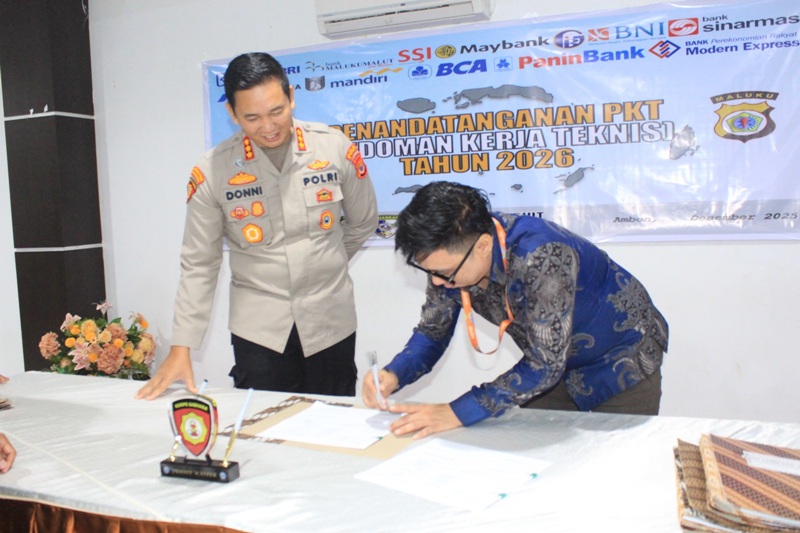 MALUKU — Kepolisian Daerah (Polda) Maluku menegaskan komitmennya dalam memperkuat sistem pengamanan objek vital nasional dan objek tertentu melalui penandatanganan Pedoman Kerja Teknis (PKT) Jasa Pengamanan Tahun Anggaran 2026, yang digelar Direktorat Pengamanan Objek Vital (Ditpamobvit) Polda Maluku di Marina Hotel, Jalan Yan Paays, Kota Ambon, Selasa (23/12/2025).