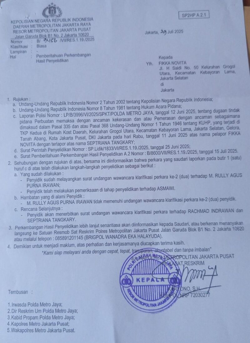 Proses penyelidikan yang dilakukan oleh Kepolisian Resor Metropolitan Jakarta Pusat mulai menemukan titik terang. Surat perkembangan hasil penyelidikan menyebutkan nama Septriana Tangkary sebagai terduga pelaku.