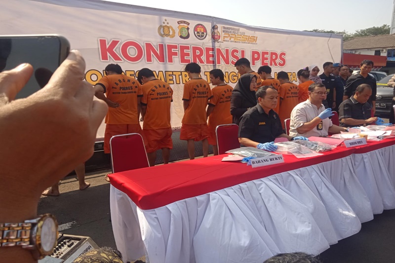 Polres Metro Tangerang Pres Rilis berhasil mengamankan 10 terduga pelaku pemerasan, 10 Agustus 2023.