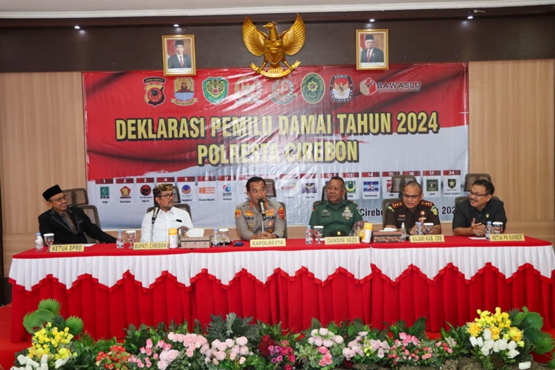 Cirebon, Suararepubliknews.com – Dalam rangka menjaga ketertiban dan keamanan menjelang Pemilu 2024, Polresta Cirebon menggelar deklarasi damai yang berlangsung di Aula Pesat Gatra Mapolresta Cirebon, Rabu (16/8/2023). Deklarasi tersebut juga melibatkan seluruh elemen di Kabupaten Cirebon.