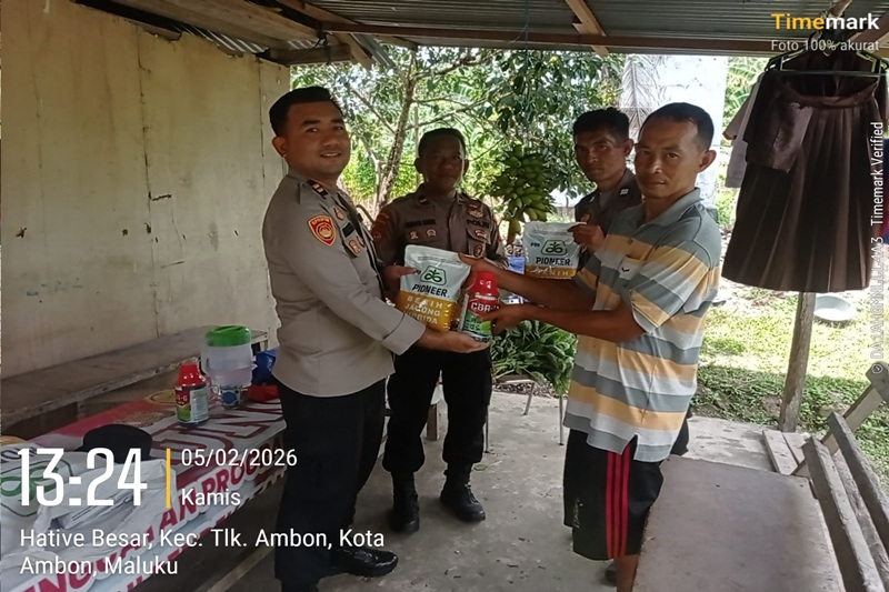 Pada Kamis (5/2/2026) sekitar pukul 13.55 WIT, Kapolsek Teluk Ambon IPTU Restu H. Purba, SH, MH, didampingi Kanit Binmas IPDA Burhan Nawir dan Bhabinkamtibmas Negeri Hative Besar AIPTU I Komang Adi Sukerta, menyerahkan bantuan bibit jagung pipil dan cairan herbisida kepada Kelompok Tani Sumber Rezeki.