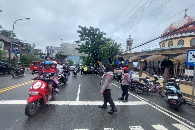 Pelaksanaan pengamanan ibadah shalat jumat dilakukan mulai dari pengaturan arus lalulintas, hingga membantu masyarakat menyeberang jalan.