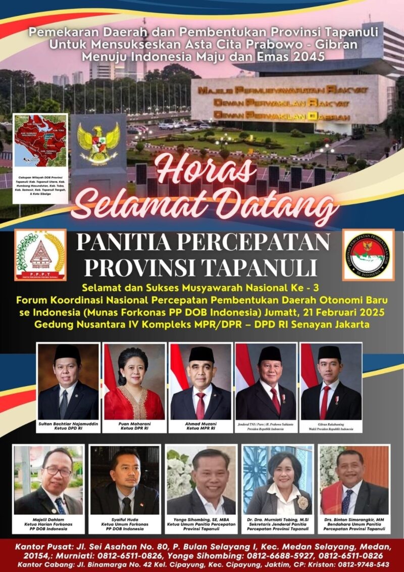 Medan, Suararepubliknews -Panitia Percepatan Provinsi Tapanuli (PPPT) siap menghadiri acara Musyawarah Nasional Ke- 3 Forum Koordinasi Nasional Percepatan Pembentukan Daerah Otonomi Baru se Indonesia (Munas Forkonas PP DOB Indonesia), Jumat, 21 Februari 2025 Gedung Nusantara IV Kompleks MPR/DPR – DPD RI Senayan Jakarta.