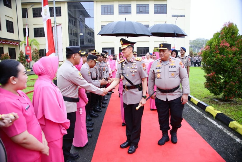 Setelah memasuki halaman Markas Polda Maluku sambil berjalan kaki, Kapolda dan Wakapolda Maluku kemudian disambut para pejabat utama Polda Maluku serta Bhayangkari dan Kapolres/Kapolresta Jajaran di depan pintu utama Mapolda Maluku.