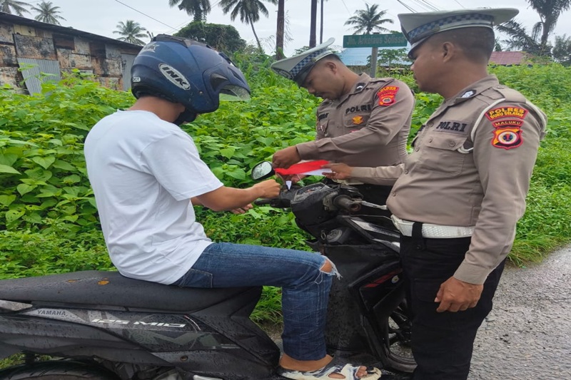 Sambut HUT RI ke-80, Sat Lantas Polres Buru Selatan Bagikan Bendera Merah Putih Kepada Pengendara Bermotor