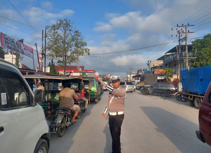 Pengaturan lalu lintas dilakukan di Jalan Lintas Sumatera (Jalinsum), sebuah titik strategis yang dikenal padat arus kendaraan. Personel Sat Lantas Polres Humbang Hasundutan mengatur arus lalu lintas sekaligus memberikan himbauan kepada para pengguna jalan agar selalu mematuhi peraturan lalu lintas, demi keselamatan bersama.