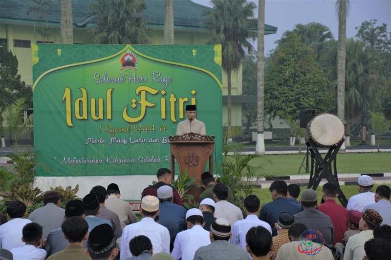 Sholat Ied, Faidus Sa’ad, S.Ag., M.S.i selaku imam sekaligus hatib Perkokoh Toleransi Umat Beragama Banyumas, Lapangan Upacara Makorem 071/Wijayakusuma, Sokaraja, Banyumas, Sabtu (22/4/2023).
