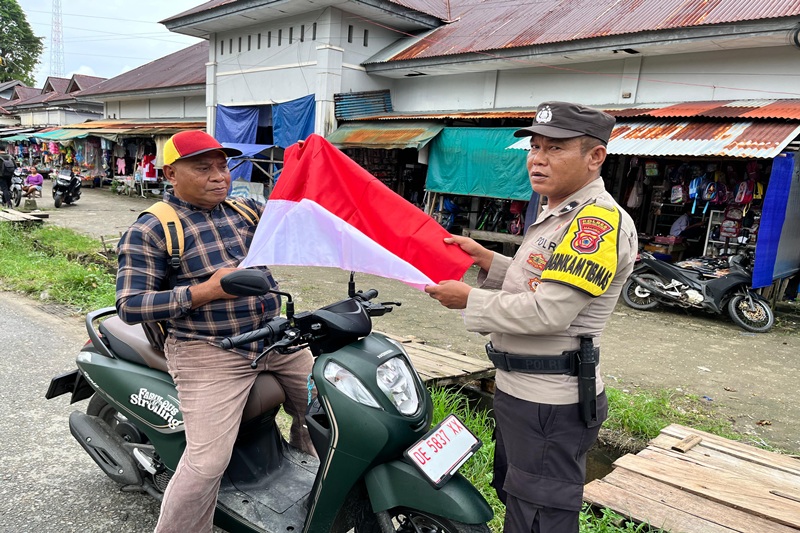 MALUKU- Personel Polres Buru Selatan bersama Polsek Namrole menemui masyarakat, sekaligus membagikan Bendera Merah Putih secara gratis di pasar Kaiwait, Desa Labuang, Kecamatan Namrole, Selasa (5/8/2024).