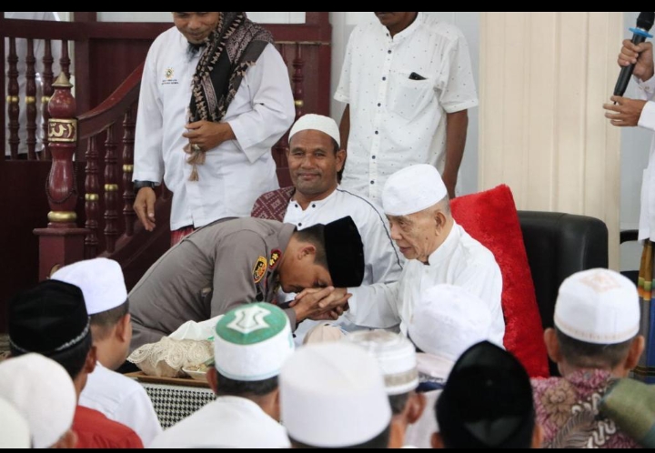 Tokoh Ulama Abuya Syekh H. Amran Waly Al-khalidy Peusijuk Kapolres Aceh Barat AKBP Andi Kirana S.I.K., di Mesjid Ahlisunnah Babussalam Gampong.