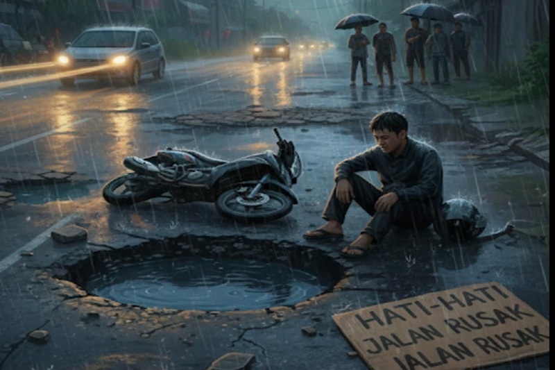Kondisi ini diperparah dengan tingginya intensitas hujan yang membuat lubang-lubang tersebut seringkali tergenang air, sehingga tidak terlihat oleh pengendara dan menjadi “jebakan maut” bagi pengguna sepeda motor.