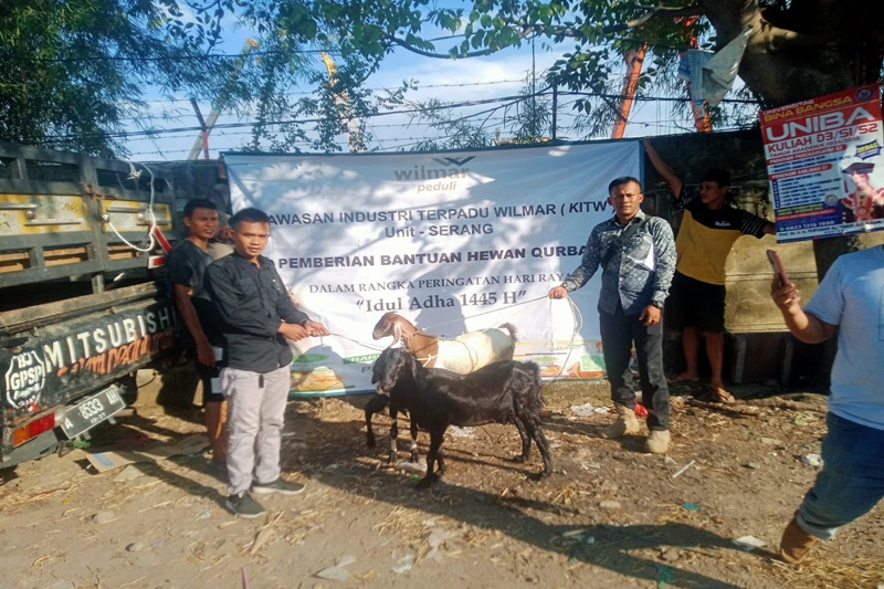 Kab.Serang,Suara Republik News -Wilmar Group yang diwadahi dalam Wilmar Region Banten melalui Kawasan Industri Terpadu Wilmar (KITW) yang ada di Desa Terate, Kecamatan Kramatwatu, Kabupaten Serang pada momen Hari Raya Idul Adha 1445 Hijriah membagikan sebanyak 43 hewan qurban meliputi 9 ekor sapi dan 34 ekor kambing kepada warga Kabupaten Serang.