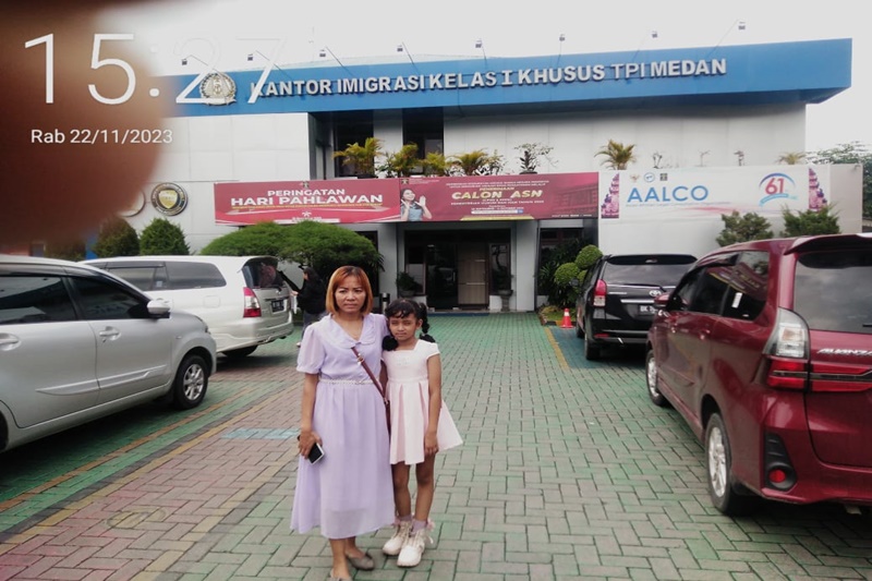 Susilawaty Samosir Bersama anak di depan kantor Imigrasi Medan, ( 22/11/2023.