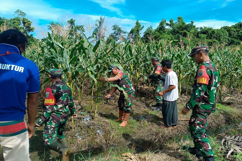 Koramil 07/Mapurujaya Kodim 1710/Mimika bersama kelompok tani melaksanakan panen  jagung bersama pada Rabu (17/4/2024)