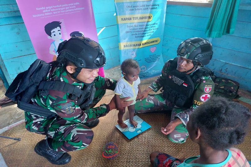 . Upaya pencegahan stunting terus dilakukan Satgas Yonif Raider 600/Modang dengan melakukan pemberian gizi tambahan untuk perkembangan dan tumbuh kembang anak seperti yang dilakukan di Kampung Kiworo, Senin (3/4/2023).